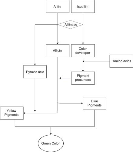 Formation of pigment cannot be inhibited drastically (i.e., by interventions at the genetic level) as it shares the same biosynthetic pathway of bioactive and flavor compounds. Therefore, the phenomenon of greening needs to be controlled by preventive practices during garlic storage and/or processing (Zang et al., 2013).