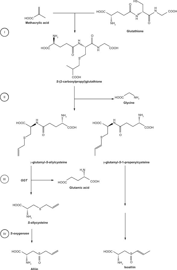 S-alk(en)ylcysteine sulfoxides are present in all plants belonging to the genus Allium, especially alliin (S-allylcysteine sulfoxide) and isoalliin (S-1-propenylcysteine sulfoxide) (Martins et al., 2016). These compounds comprise analk(en)yl group, probably originating from valine catabolism, and a cysteine moiety derived from glutathione. The currently proposed alliin and isoalliin biosynthesis pathway (Figure 3 [Yoshimoto et al., 2019]), recently reviewed by Yoshimoto et al. (2019), includes: (i) the conjugation of glutathione to methacrylic acid or methacrylic-CoA (both derived from valine catabolism) to form S-(2-carboxypropyl)glutathione (Granroth, 1970; Lancaster and Shaw, 1989; Suzuki et al., 1962); (ii) the formation of γ-glutamyl-S-1-propenylcysteine and γ-glutamyl-S-allylcysteine (precursors of isoalliin and alliin, respectively) after removal of glycyl from S-(2-carboxypropyl) glutathione and its conversion into the S-1-propenyl and/or S-2-propenyl group by oxidative decarboxylation; (iii) the sulfide formation after removal of the γ-glutamyl group catalyzed by γ-glutamyl transpeptidases enzyme (GGT); and (iv) the S-oxygenation of intermediate sulfides into alliin and isoalliin catalyzed by a flavin-containing S-oxygenase.
