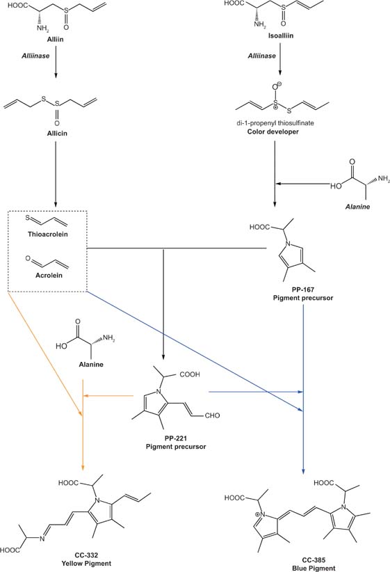 Figure 4. Formation of yellow (CC-332) and blue (CC-385) pigments from alliin and isoalliin. Other yellow and blue pigments can be formed, not shown in the figure.