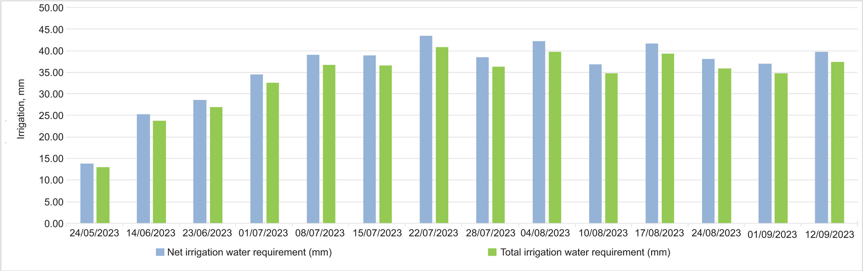 Figure 1. Total and net irrigation water requirements throughout the eggplant growth period.