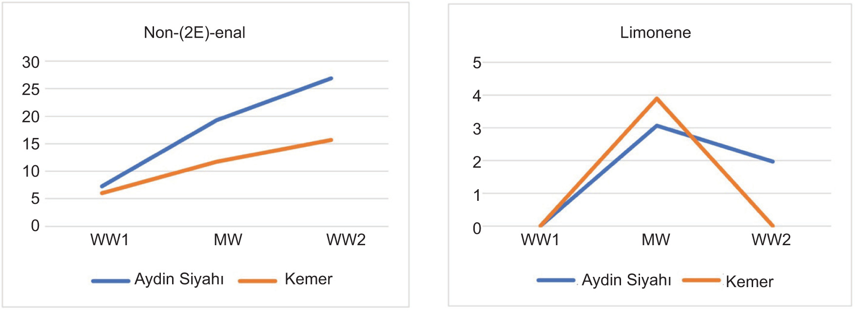 Limonene is a volatile compound with a pleasant and intense fragrance. It is commonly used in cleaning products because of its stain-removing properties and exhibits antifungal and antibacterial activity (Yaşar et al., 2017). However, when applied to fruit peels, it causes discoloration (Beuning et al., 2010). Our study identified limonene in the Aydın black variety (Aydın Siyahı), and a decrease in purification levels reduced limonene content (Table 5 and Figure 3).