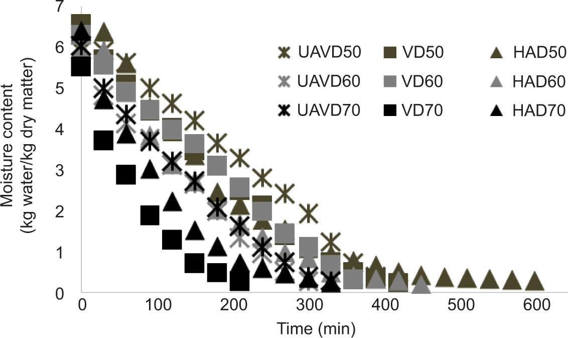 Figure 1. Drying curves of kiwi fruit dried with HAD, UAVD, and VD.
