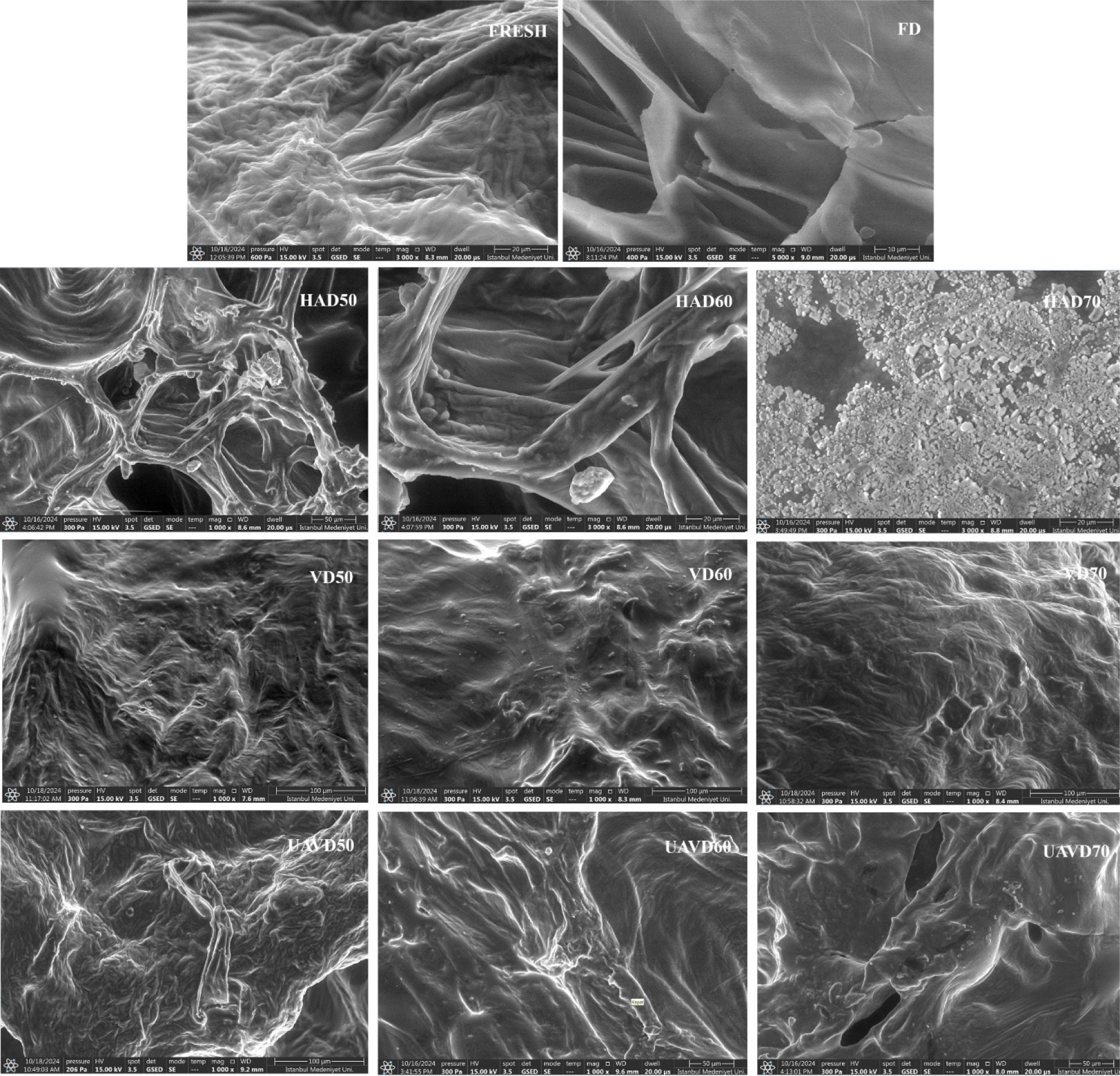 The ESEM images revealed distinct microstructural changes in kiwi samples subjected to different drying methods and temperatures (Figure 2). Fresh kiwi sample showed smooth and intact cellular structures indicative of natural moisture retention. FD kiwi samples maintained a highly porous, well-preserved structure because of sublimation under vacuum, thereby minimizing cellular damage. In contrast, HAD at increasing temperatures (50°C to 70°C) caused pronounced shrinkage, cell collapse, and fragmentation, with HAD70 exhibiting the most severe structural damage because of thermal stress. VD showed moderate disruption, with less compact and more defined structures than HAD, while UAVD samples demonstrated better cell integrity and a more porous texture, suggesting that ultrasound helps to mitigate structural damage during drying.