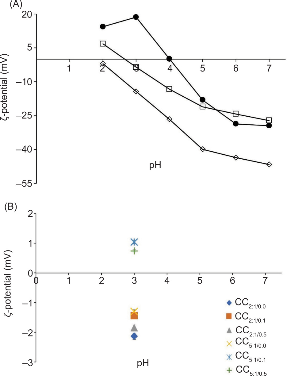 Figure 2. (A) ζ-potential variation as a function of pH for amaranth protein (AP) (●), cacao pod husk pectin (CP) (◊), and phenolic extract of cacao shell/husk (PE) (□) solutions (0.01% w/w). (B) ζ-potential of ternary complex coacervates (CCa/b) at different AP:CP weight ratios and PE concentrations (0.0, 0.1, 0.5%) as a function of pH.
