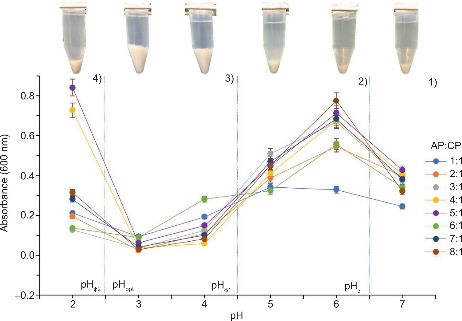 Figure 3. Change in the absorbance of supernatants from complex coacervates of amaranth protein (AP) and cacao pod husk pectin (CP) (1%, w/w) at different AP:CP ratios as a function of pH.