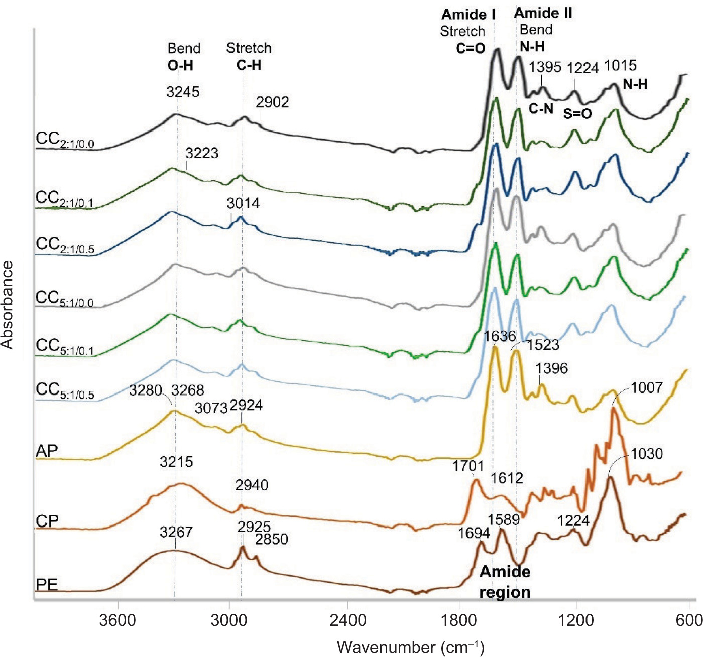 Figure 4 shows the FTIR spectra of AP, CP, PE, and the CCa/b variations. AP exhibited an absorption band at 3268 cm–1 corresponding to the contraction vibrations of O-H, attributed to hydrogen bonds present in the water. In addition, it presented a weak band at 3073 cm–1 appropriate for C-H stretch vibration and an N-H bond tension vibration band at 3280 cm–1 belonging to the amine B group (Raei et al., 2018). It also showed peaks at 1636, 1523, and 1396 cm–1 corresponding to the stretching and flexural bonds of C=O, N-H, and C-N characteristic of amides I, II, and III, respectively. The amide I region is considered helpful for the analysis of the secondary structure of proteins, as this structure is more susceptible to unfolding, folding, or aggregating, and its molecular interactions, chemical reactivity, and functional properties depend on it (Trujillo-Ramírez et al., 2018). CP had an absorption band at 3215 cm–1 corresponding to the vast stretch of the O-H bond and a stretch band of the C-O-C bond at 1007 cm–1 due to the hydrogen bonds of galacturonic acid (Lan et al., 2020). At 2940 cm–1, a peak was associated with stretching the C-H bond of methyl groups (-CH3). In addition, it had two peaks, one at 1701 and the other at 1612 cm–1, characteristic of the esterified carboxyl group (-COOCH3) and carboxylate group (-COO–), respectively, associated with the carbonyl group (C=O) present in carbohydrates (Raei et al., 2018). The PE spectrum exhibited a broad absorption band at 3267 cm–1, corresponding to the stretching of the O-H bond. In addition, it presented peaks at 2925 cm–1 and 2850 cm–1, corresponding to the stretching of the C-H bond, associated with the -CH2 and -CH3 groups, respectively; this indicates the presence of phenolic groups in the extract. Two peaks at 1589 and 1224 cm–1 were evidenced that can be attributed to aromatic rings (Eze et al., 2022), and a peak at 1693 cm–1 characteristic of the carboxyl group (-COOH), which indicates the presence of phenolic acids. Likewise, it exhibited a band at 1030 cm–1, typical of stretching the S=O bond, showing the presence of sulfur amino acids in the extract (Kashyap et al., 2022).