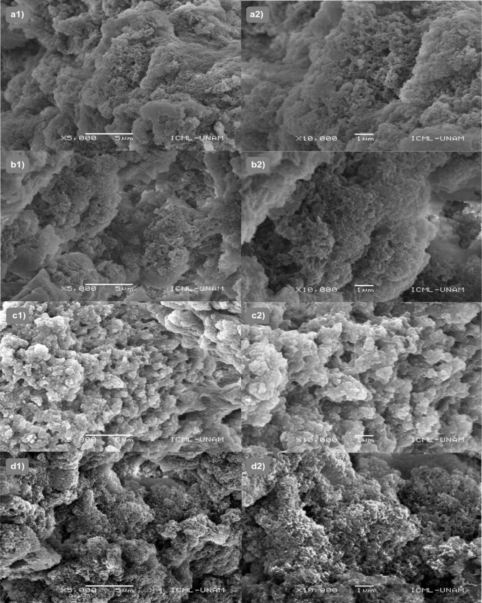 Figure 5. SEM micrographs of ternary complex coacervate variations (CCa/b), with different AP:CP weight ratios (a/b): CC2:1/0.1 (a), CC2:1/0.5 (b), CC5:1/0.1 (c), CC5:1/0.5 (d). Magnifications: 5000× (1) and 10000× (2).
