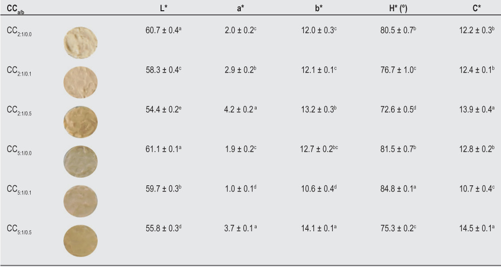 According to the CIELAB system, the color parameters show coordinates that cover the entire color range perceived by the human eye, where: -a* = green, +a* = red, -b* = blue, +b* = yellow, L* = 0 to 100 (black/white), the angle of tone (H*) = 0 to 360° (red), 90° (yellow), 180° (green), 270° (blue), and saturation (C*) = 0 to 100 (Kuck and Noreña, 2016). Table 3 presents the results of the color parameters for the CCa/b variations. L* values ranged from 54.4 ± 0.2 to 61.1 ± 0.1, indicating that the samples presented a predominantly light color. CCa/b variations not containing PE had significantly higher L* values than those containing PE (CC2:1/0.1, CC2:1/0.5, CC5:1/0.1, and CC5:1/0.5). Values of a* and b* were positive, showing a tendency of the CCa/b to red and yellow, respectively.