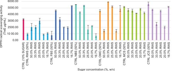 Figure 4. DPPH radical scavenging activities of spiced syrups prepared from different type of sugar and concentration.