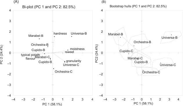 The first component (PC 1) was positively associated with two textural attributes: moistness and granularity, and sweetness, and negatively associated with the typical potato flavour. Granulation, moistness and sweetness were highly correlated to each other. The second component (PC 2) was positively associated with hardness, and negatively associated with granularity. The two Universa samples (Universa_B and Universa_C) were highly and positively associated with PC 1, thereby showing a positive correlation with attributes having a positive loading on this component. Instead, Marabel (Marabel_B and Marabel_C), Cupido (Cupido_C and Cupido_B) and Orchestra_B samples had a negative correlation on PC 1, thereby associated with a high intensity of typical potato flavour. However, Cupido_B, Cupido_C, Marabel_C, Orchestra_C and Universa_C had a negative score on PC 2. The bootstrap hulls plot showed samples with their confidence areas (Figure 1B). Some overlapping was observed in terms of perceptive properties, especially between Marabel_C and Cupido_B and between Cupido_C and Marabel_B, suggesting perceptive similarities between these two cultivars. Instead, Universa_B was clearly the most diverse sample which did not show perceptive overlaps with other samples.