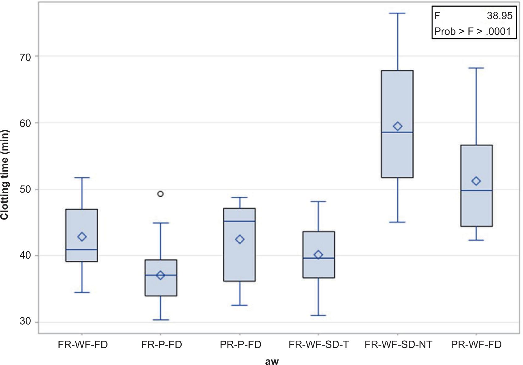 Figure 3 shows the box plot of the distribution of clotting time according to aw classes. We observed that the two samples with higher aw had higher coagulation time. These samples came from whole flowers collected at a pre-ripening stage and quickly dried (PR-WF-FD) (aw = 0.623) and from whole flowers slowly dried and not toasted (FR-WF-SD-NT) (0.557). The other samples had lower aw and faster clotting times. These included FR-WF-SD-T slowly dried and toasted samples (0.457); PR-P-FD pistils quickly dried from premature (0.401) and FR-P-FD mature flowers (0.324); and FR-WF-FD whole flowers dried quickly and collected when fully ripe (0.323).