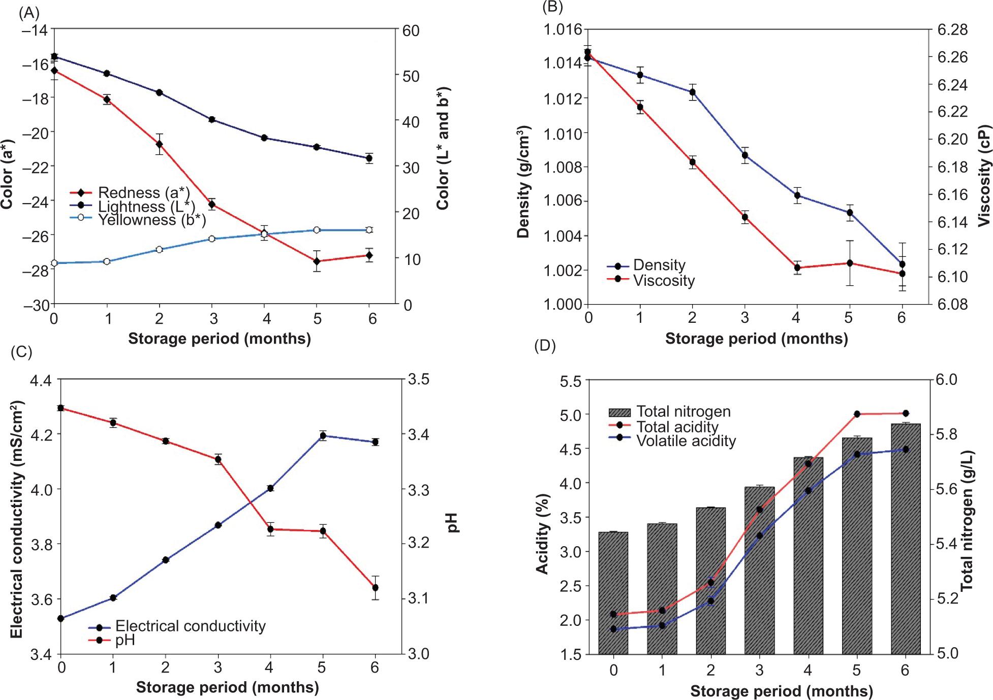 WACV was bright yellowish. During the vinegar-making process, the usual pinkish-yellow WAC wholly turned yellow (Figure 2A). Furthermore, the color changes were consistent during the prolonged storage of WACV (the yellowness increased during storage). On the other hand, the lightness representing luminosity and redness, with negative values representing the darkness, tended to decrease throughout the storage period without many fluctuations in the results. The vinegar samples’ color changes could be caused by maturation, with the degradation of anthocyanin residues in WACV and potential effects from acidification. Mas et al. (2014) reported that polyphenolic compounds are responsible for the color and astringency of vinegar. Tarazona-Diaz and Aguayo (2013) observed the reduced redness in the fruit juice during acidification, which agreed with the present study as the pH of WACV increased during storage (Figure 2C). The density decreased steadily, along with viscosity throughout the storage of WACV (Figure 2B). The vinegar density is linked to acetic acid density directly in case it has been distilled.
