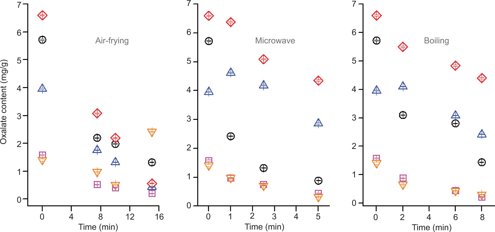 Figure 4. Effect of different cooking methods on the oxalate content of kale (⬜), spinach (○), beans (△), carrot (▽) and tomatoes (◊).