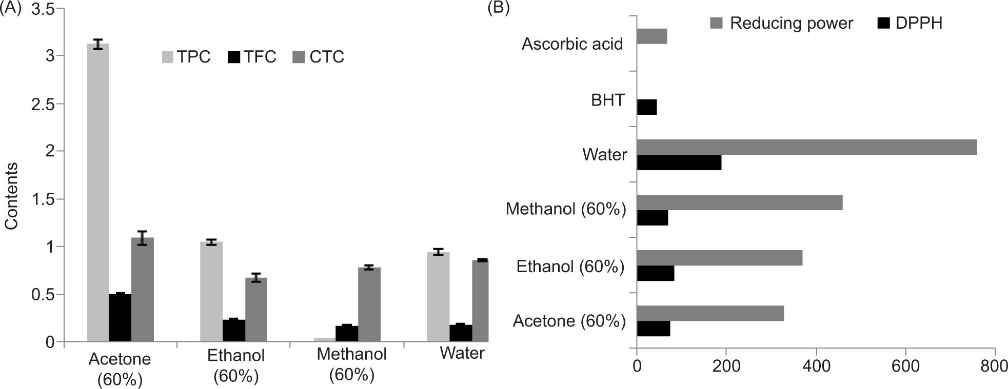 Figure 1. (A) TPC, TFC and CTC of different solvent extracts, and (B) antioxidant activities of ZLP. TPC: total polyphenols content (mg GAE/g MS); TFC: total flavonoids content (mg CE/g MS); CTC: condensed tannins content (mg CE/g MS); DPPH (IC50, µg/mL); reducing power (EC50, µg/mL); GAE: gallic acid equivalents; CE: catechin equivalents.