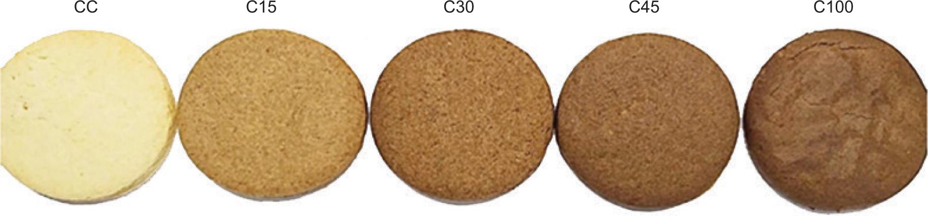 Regarding texture analysis, results revealed that the hardness and fracturability (brittleness) of cookies were increased significantly (p < 0.05) with the addition of ZLP. In all formulated cookies, C100 sample had the highest hardness and fracturability values (74.33 N and 6.8 mm) compared to CC sample (22.33 N and 0.58 mm). Similar results were also observed in previous findings in which cookies were enriched with bamboo shoot, spinach, Tinospora cordifolia stem and tomato powder (Ajila et al., 2008; Bhat et al., 2020; Galla et al., 2017; Tyagi et al., 2020). This increase in texture parameters are explained by the presence of ZLP, with high content of polysaccharides, which may lead to the dilution of gluten and extensive gluten structure. In addition, substituting ZLP for wheat flour in cookies formulation decreased its gluten content responsible for the viscoelastic character of dough. Das Chagas et al. (2020) affirmed in their study on cookies enriched with camu-camu coproduct powder that reduction of glutenin and gliadin proteins could have a remarkable effect on the formation of viscoelastic dough, which may possibly lead to increased hardness.