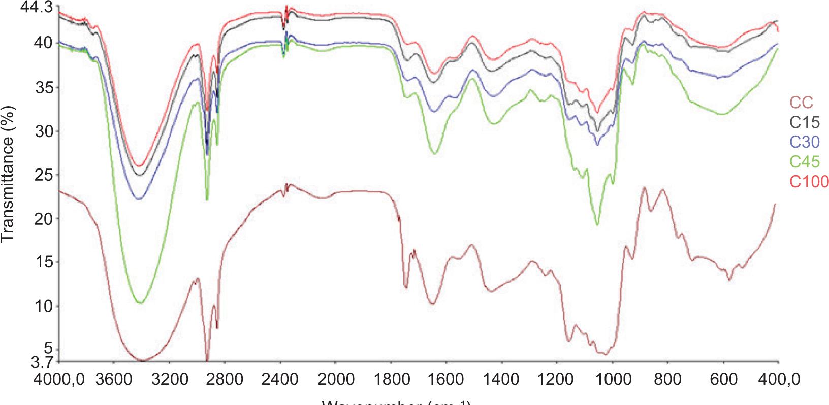 Figure 3. FTIR spectra of cookie samples; CC: control cookies; C15, C30, C45 and C100 are cookie samples containing wheat flour:ZLP in the ratio of 85:15, 70:30, 55:45 and 0:100, respectively.
