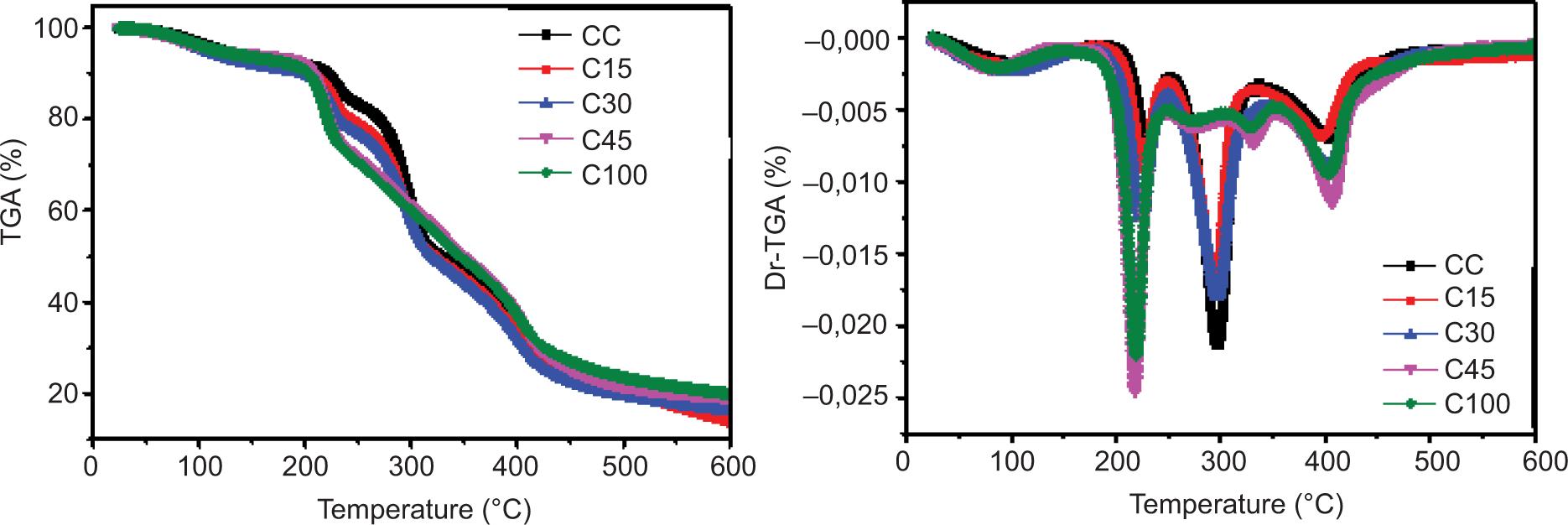 Figure 4. (A) Thermogravimetric, and (B) differential thermogravimetric curves of cookie samples; CC: control cookies; C15, C30, C45 and C100 are cookie samples containing wheat flour:ZLP in the ratio of 85:15, 70:30, 55:45, 0:100, respectively.