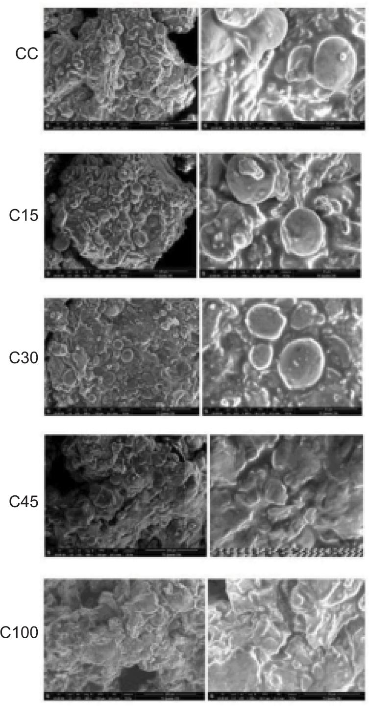Figure 5. SEM of cookies samples. Magnification ×400 and ×500; CC: control cookies. C15, C30, C45, C100 are cookies samples containing wheat flour: ZLP (85:15, 70:30, 44:45, 0:100).