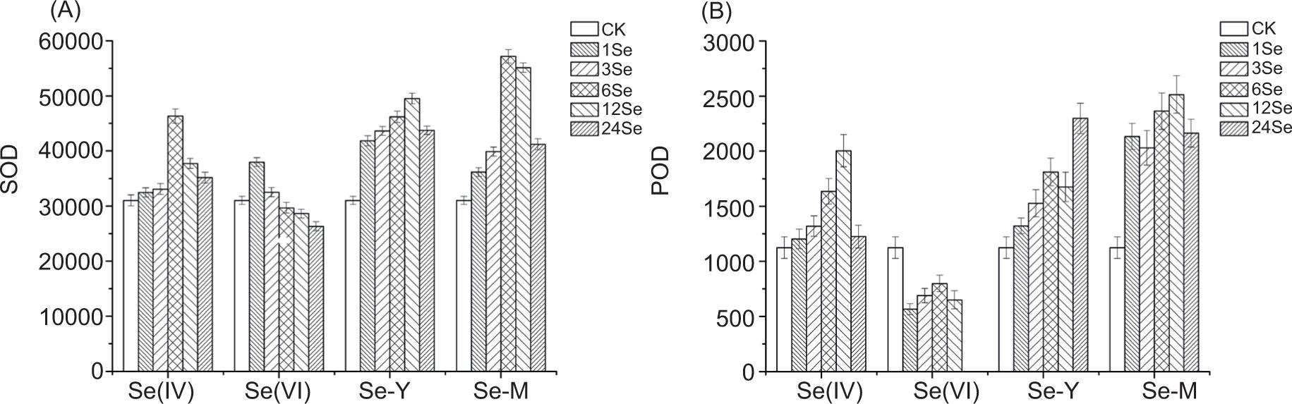 Figure 3. (A) The superoxide dismutase (SOD) activity in radish with application of different Se sources: sodium selenite (Se(IV)), sodium selenate (Se(VI)), selenium yeast (Se-Y) and selenium malt (Se-M) (U g–1 h–1 FW). (B) The peroxidase activity in radish with application of different Se sources: sodium selenite (Se(IV)), sodium selenate (Se(VI)), selenium yeast (Se-Y) and selenium malt (Se-M) (μg g–1 min–1 FW).