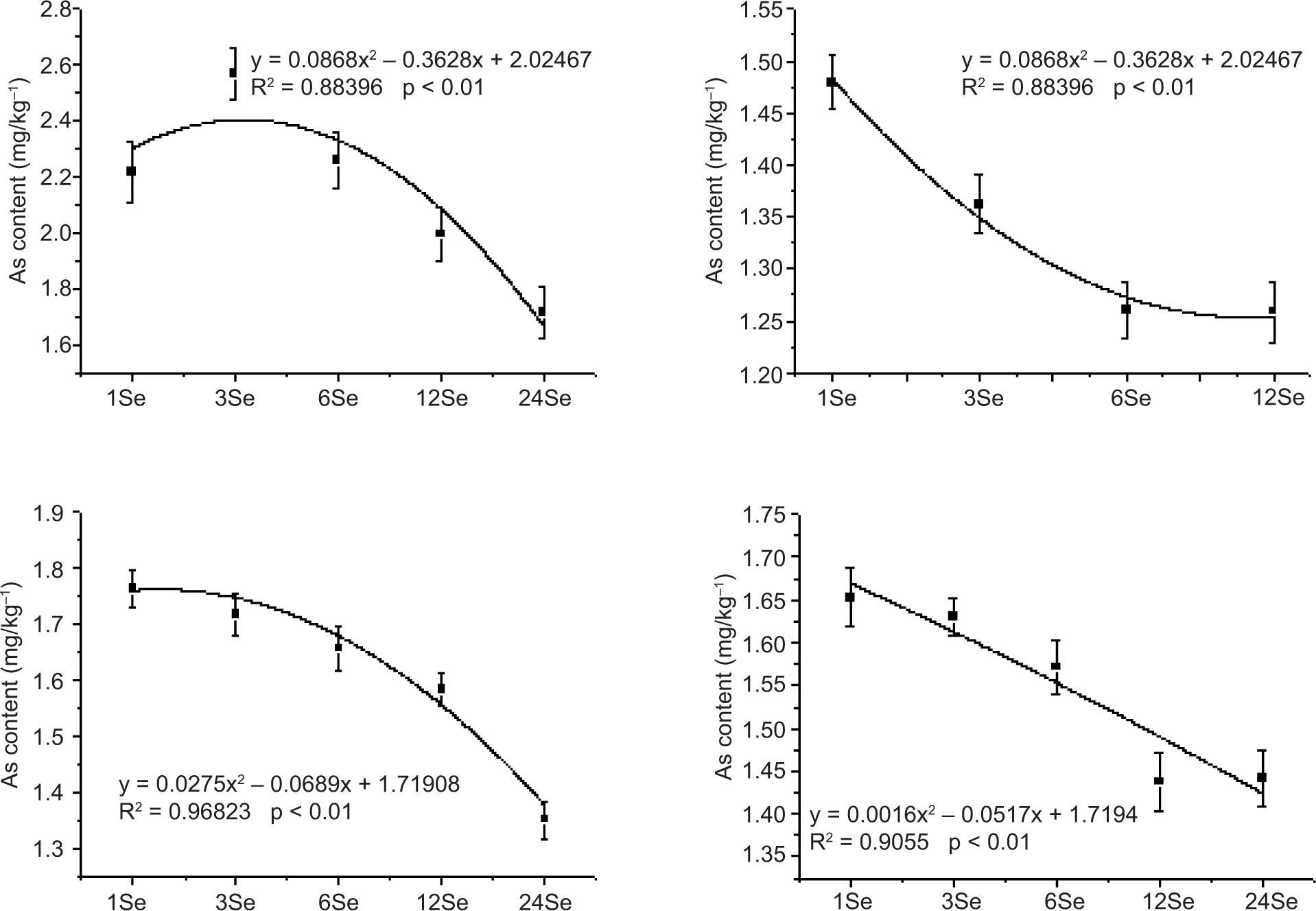 Figure S2. Relationship between arsenic content in radish roots and the adding amount of exogenous selenium of sodium selenite (Se(IV)), sodium selenate (Se(VI)), selenium yeast (Se-Y) and selenium malt (Se-M).
