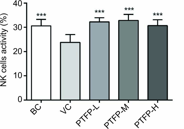 To further investigate the effect of PTEP on immunological enhancement, the cytotoxic activity of NK cells against human leukemia K562 cells was determined. The NK cells activity of splenocytes significantly increased in mice orally administrated with PTFP compared with the VC group (Figure 6) and was more strongly induced in PTFP-L and PTFP-M groups vs. the PTFP-H group.