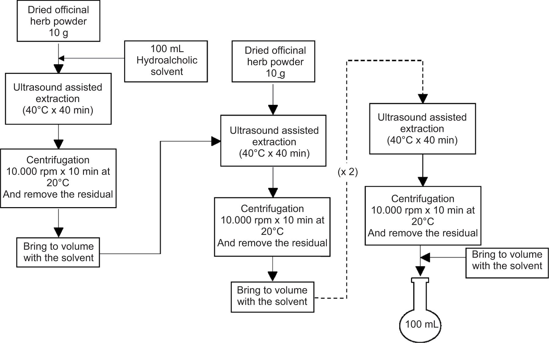 Cascade extraction consists of using the extract (obtained from an extraction step) as the solvent for the next step. During each step, fresh hydroalcoholic solvent (typically less than 10% of the initial volume) could be added to replace the solvent evaporated and trapped in the herb matrix during the operation, and maintain a fixed initial sample to solvent ratio (1:10). The experimental conditions of solid–liquid ratio, extraction time, temperature, and ultrasound power were applied equally to each extraction step modified from the previous officinal herb extraction conducted by Rodríguez-Pérez et al. in 2015 (see Figure 1). The optimized sequence used in this work is the following: Ptychopetalum, Turnera, Schisandra, and Poligonum. For comparison, individual extraction was also performed, similar to cascade extraction, which compensated for the lost solution (100 mL) before performing the analysis.