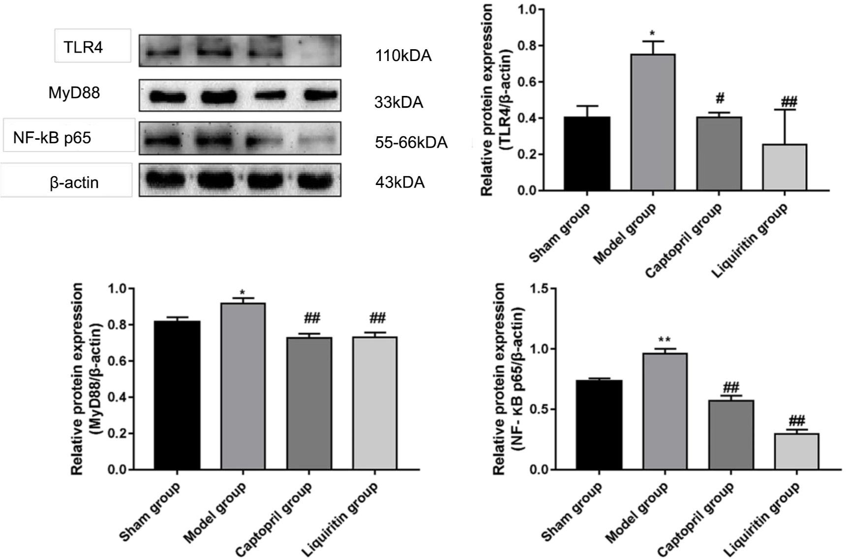 Western blotting was used to measure the expression in the TLR4/MyD88/NF-κB signal pathway. As shown in Figure 6, the expression of TLR4, MyD88, and NF-κB p65 were significantly increased in the model group compared with the sham group (P < 0.01; P < 0.05). The expression of TLR4, MyD88, and NF-κB p65 were obviously decreased in the liquiritin group and the captopril group compared with the model group (P < 0.01; P < 0.05), but there were no significant differences between the liquiritin group and the captopril group.