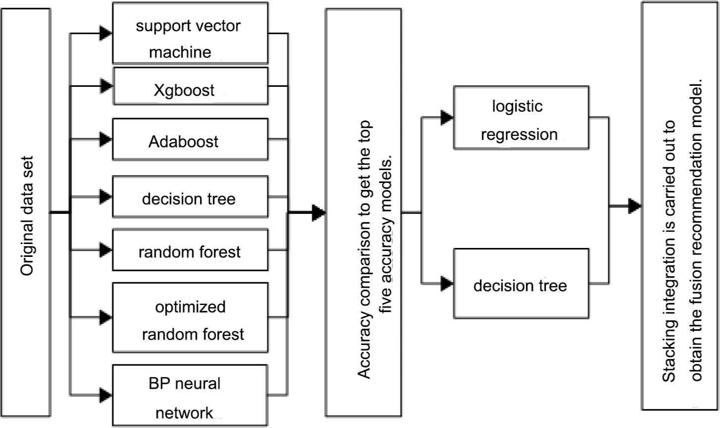 In this study, decision tree, random forest, optimized random forest, neural network, SVM, Adaboost and Xgboost algorithms modeled each wine recommendation subtask, and the top five models with the highest recommended comprehensive accuracy of each recommendation index were selected as the base models. Further, to avoid the overfitting caused by complicated model, the second meta-model selected decision tree or logistic regression model. The construction process of Stacking integrated algorithm can be concluded in Figure 2.