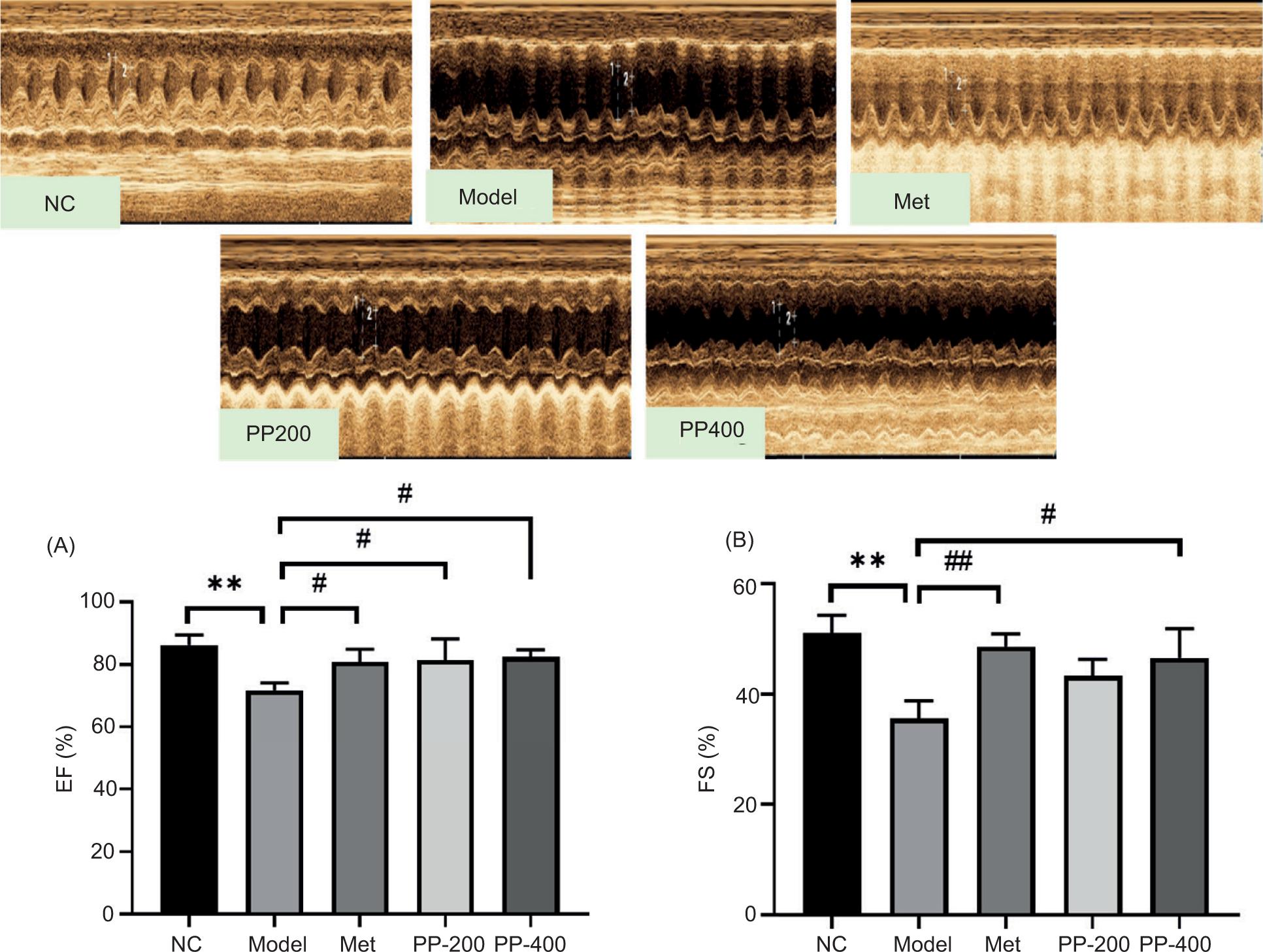 Echocardiography was performed to determine the heart function of rat in each group of rats, with EF and FS serving as primary indices. EF and FS values of the model group were considerably lower than those of the NC group (p < 0.01); however, FS and left ventricular ejection fraction (LVEF) values were reversed in both PP-400 and Met groups (p < 0.05 and < 0.01, respectively; Figure 2). The results suggested that PP had a certain ameliorative effect on diabetic cardiac function injury.