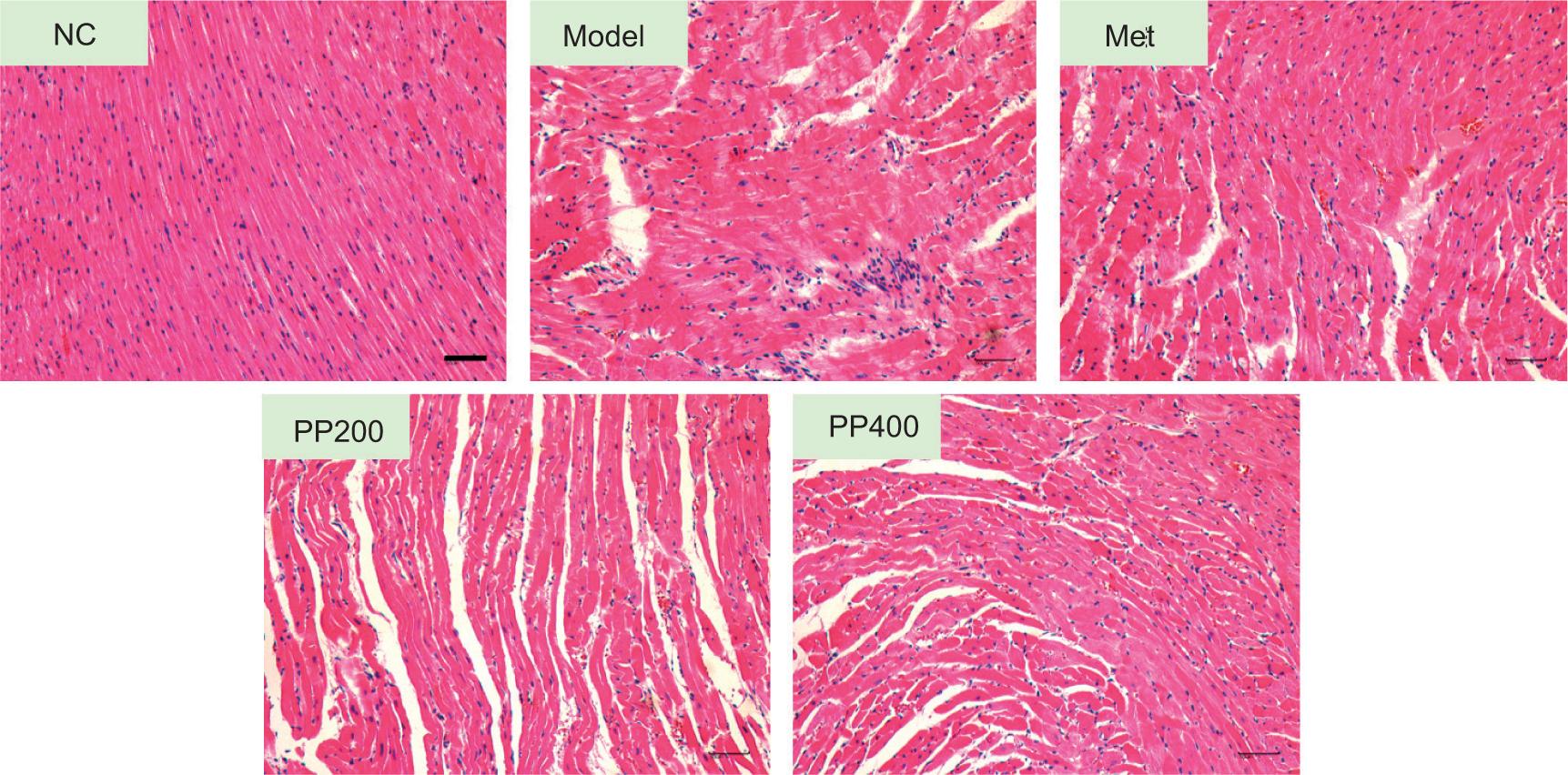 The NC group exhibited normal morphology, complete myocardial structure, and an ordered arrangement of muscle fibers, as shown by H&E staining. The model group exhibited myocardial fracture, myocardial fiber organization abnormality, and inflammatory cell infiltration. Myocardial fibers of both Met and PP groups were arranged in a relatively orderly manner with a small amount of inflammatory infiltration (Figure 3). The findings indicated that PP could greatly mitigate the progression of heart disease.
