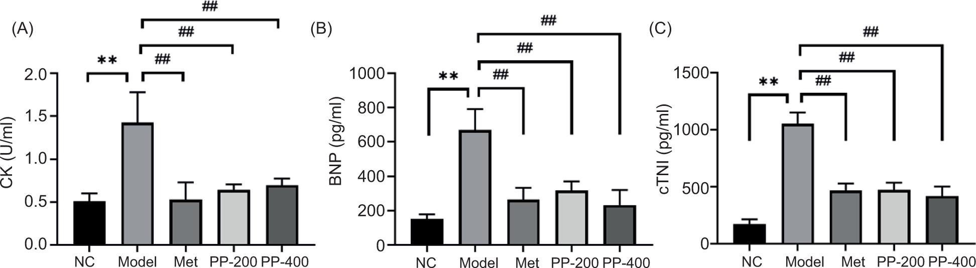Levels of CK, BNP, and cTNI were considerably higher in the model group than in the NC group (p < 0.01), but PP and metformin significantly lowered these levels (p < 0.01) (Figure 5). The results showed that PP could significantly reduce myocardial enzymes in model rats.