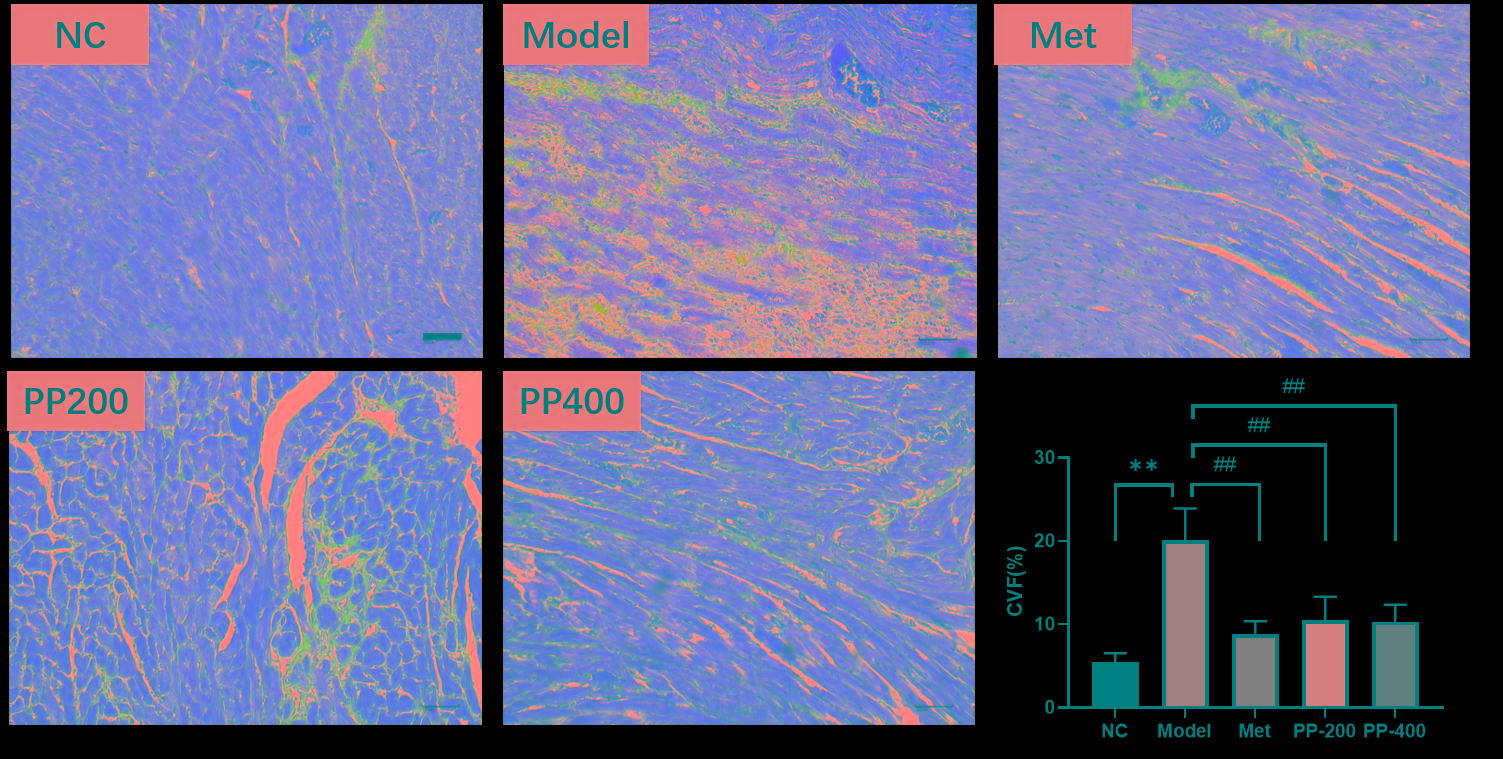 Masson staining revealed that muscle fibers of the myocardium were red and collagen fibers were blue. In the NC group, myocardial fibers were organized and only a small amount of collagen fibers was formed whereas the model group had abundant collagen fiber depositions. Pretreatment with PP and metformin, resulted in a significant reduction of collagen content of heart tissue. CVF level was considerably higher in the model group than in the NC group (p < 0.01), and PP and metformin were able to reduce the amount of CVF (p < 0.01; Figure 4).