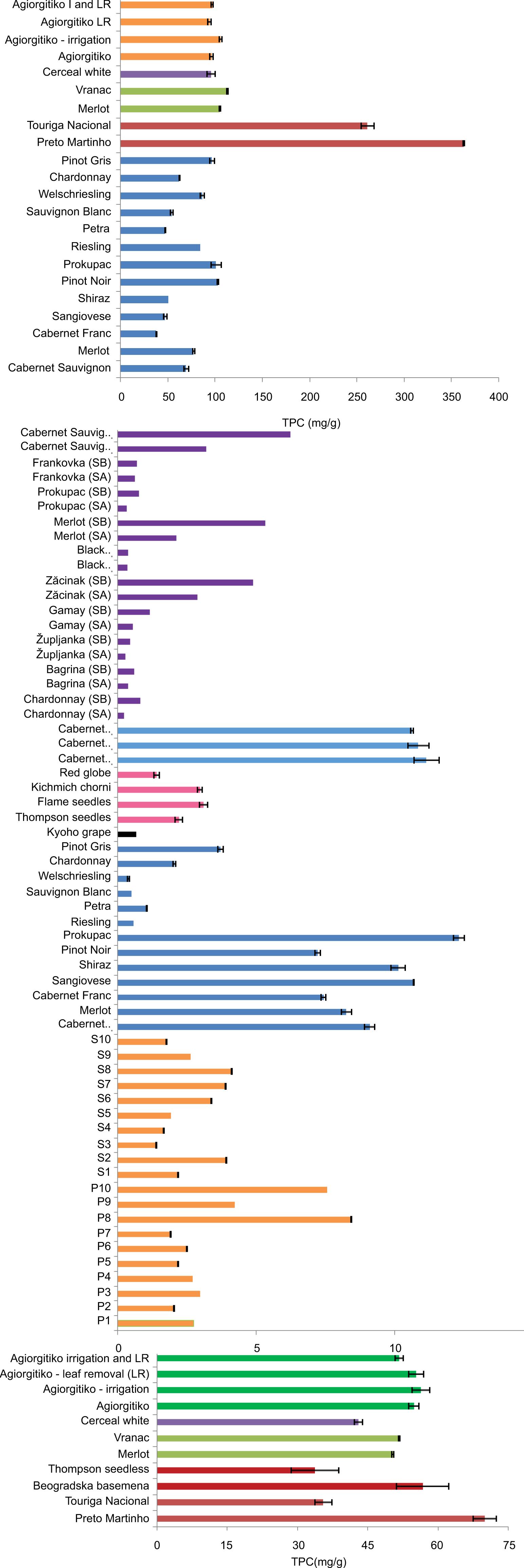 Figure 1. Graph shows the values of total polyphenols by using Folin’s reagent in seeds. Values are expressed in milligram of GA equivalent to per gram of seeds, except for Silva et al. (2018), where the equivalent is epicatechin gallate. The same colour shows the measurements of one research group. Next to each bar is the description indicating the variety used for measurements. SA: solvent A; AcEtOH: acidified aqueous ethanol; SB: solvent B; ChCit: choline chloride:citric acid; I: irrigation; LR: leaf removal. Light blue (Castro-Lopez et al., 2019), purple (Dabetic´ et al., 2020), green (Chorti et al., 2016), yellow (Dinis et al., 2020), grey (Radovanovic´ et al., 2019), orange (Silva et al., 2018) and dark blue (Pantelic´ et al., 2016).