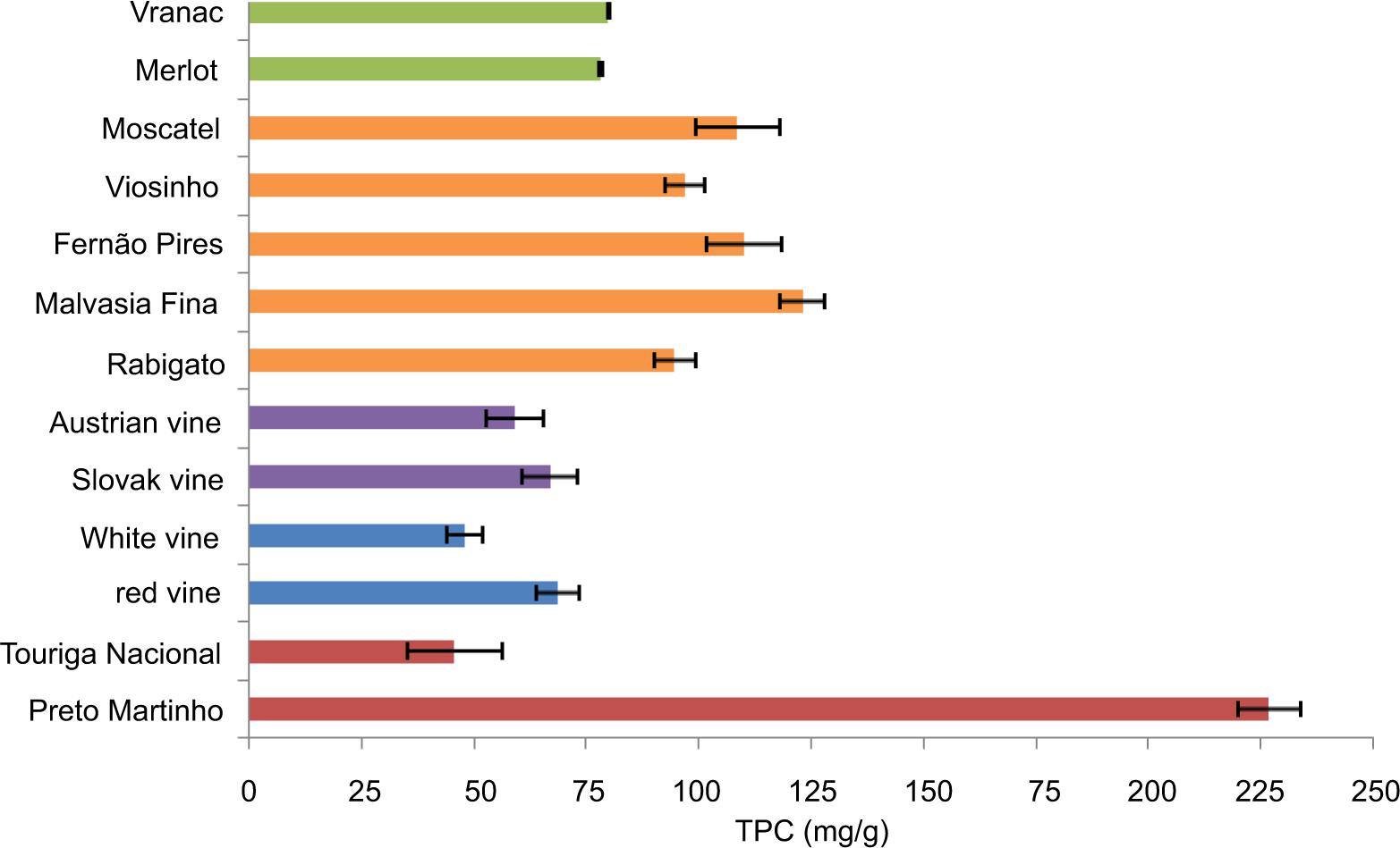 The content, abundance and distribution of polyphenolic compounds in grapevines are highly dependent on the geographical and climatic conditions, grape variety, cultivation processes and the stage of ripeness. However, there is no doubt that Vitis vinifera is one of the most important sources of polyphenolic substances, especially wine industry wastes (grape skin, stems and seeds), which represent 20% of the weight of processed grapes (Teixeira et al., 2018) and therefore are a matter of growing interest and emphasis for farmers.