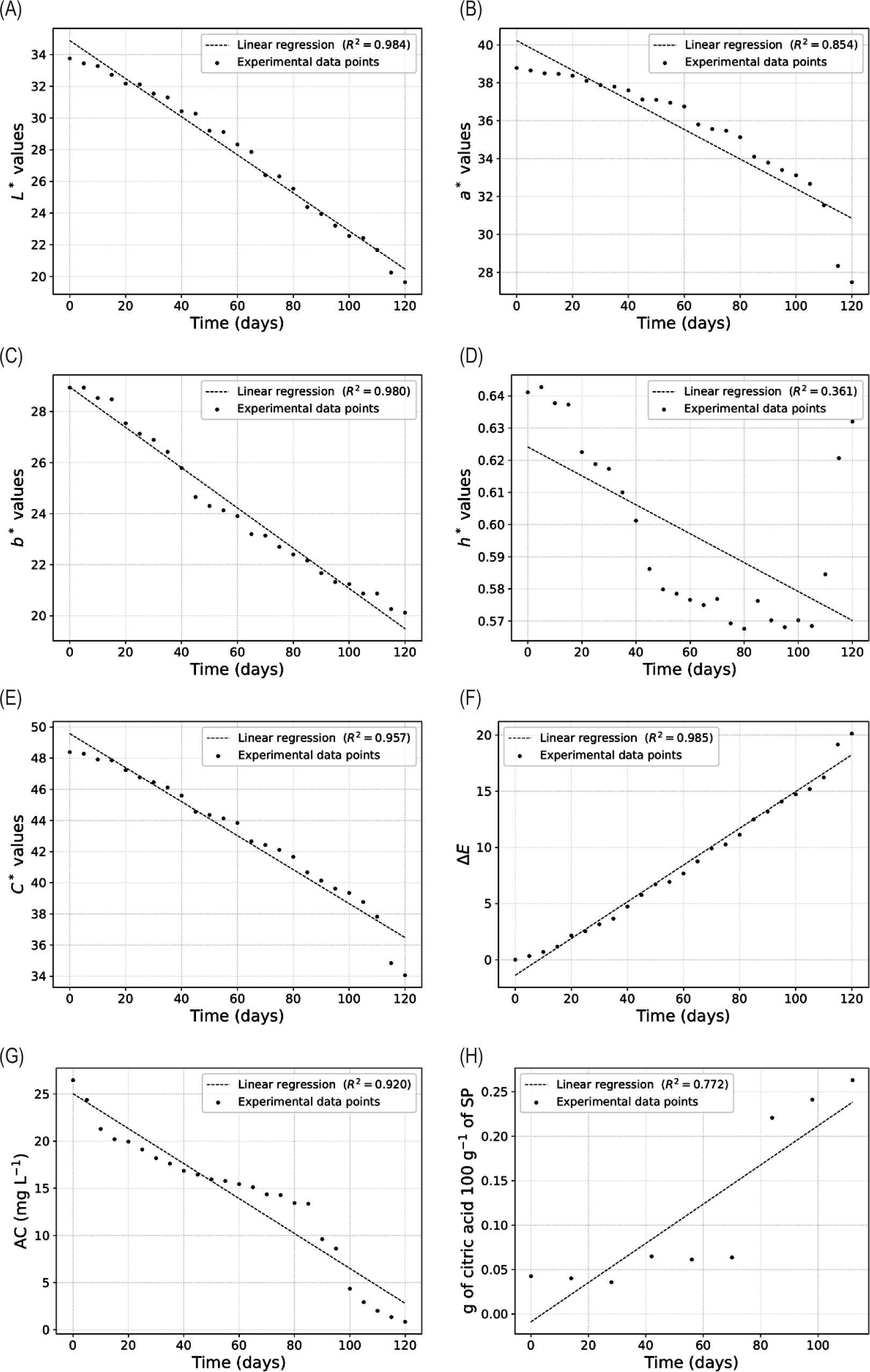 Figure 1. Scatter plots of changes in the physicochemical quality attributes of strawberry puree (SP) stored at –18°C for 120 days. (A) Lightness, (B) redness, (C) yellowness, (D) hue angle, (E) chroma or color saturation, (F) the overall color difference, (G) anthocyanin content (AC), and (H) total titratable acidity.