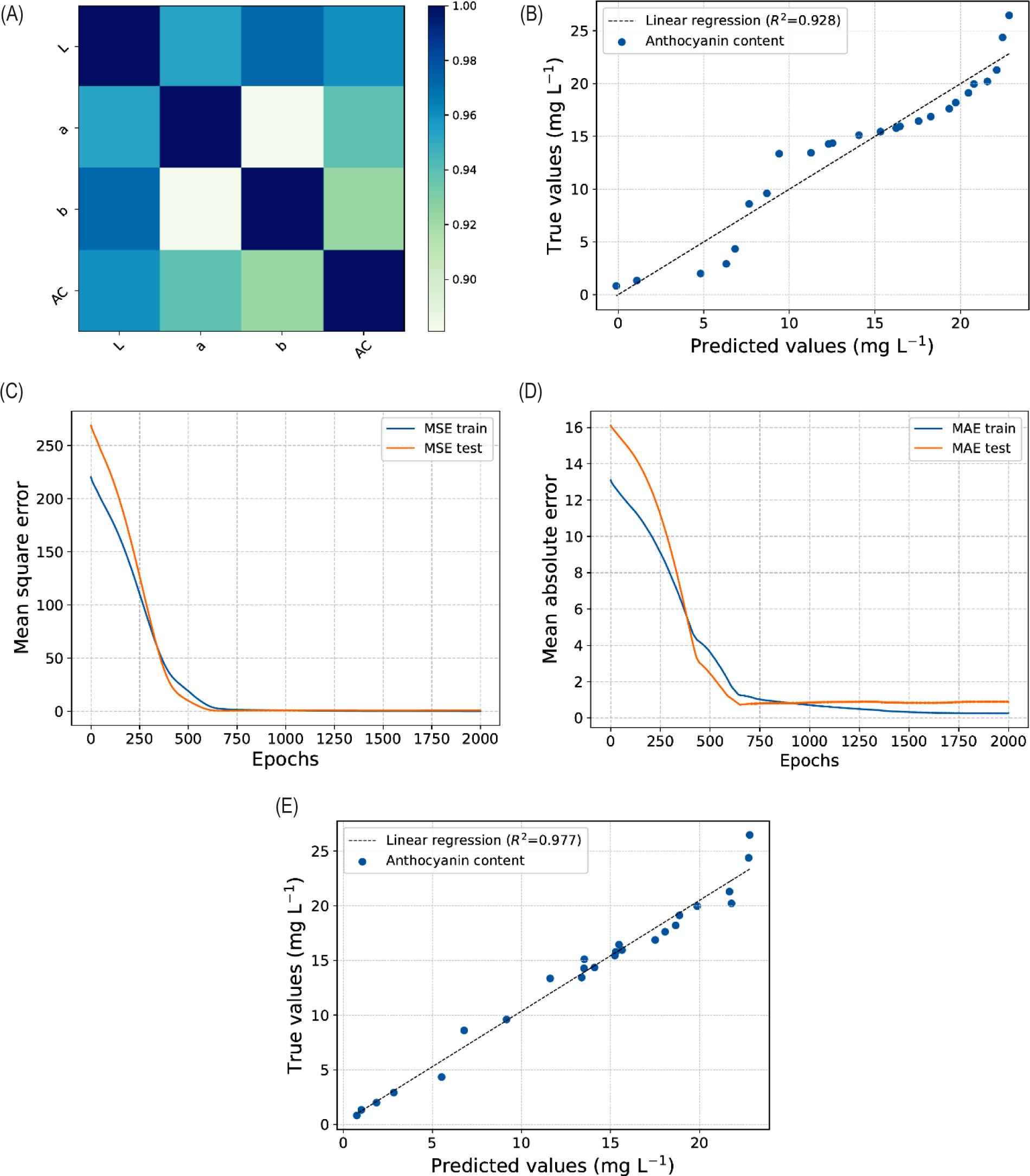 Figure 2. Results of the OLS regression model and training of ANNs model. (A) Correlation heatmap. (B) Scatter plot of the predicted vs experimental data of AC achieved by the OLS regression model. (C) Training history using the mean square error as a loss function. (D) Mean absolute error as an evaluation metric. (E) Scatter plot (predicted vs true) of the training data of AC achieved by ANNs model. The optimal regression line between estimated and measured values is shown in (B) and (D).
