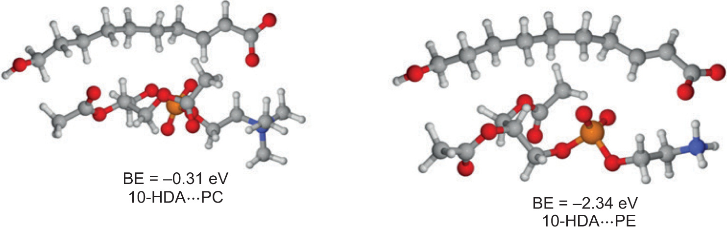 The dimer between 10-HDA anion and PC or PE (to simplify the calculation, -CH3 represented the alkane chains) molecules was studied by density functional theory (DFT), where all molecules were optimized by the Lee-Yang-Parr gradient-corrected correlation (B3LYP) hybrid functional (Becke 1993; Lee et al., 1988) method and def2-SVP (Weigend 2006) basis set with Grimme’s DFT-D3(BJ) empirical dispersion correction (Grimme et al., 2011) via Gaussian 09 package. Harmonic vibrational frequency was performed at the same level to guarantee no imaginary frequency in these molecules, i.e., they locate on the minima of the potential energy surface. Ethanol was regarded as the implicit solvent with the solvation model based on the density (SMD) model (Marenich et al., 2009) in the above calculations. The binding energy (BE) for dimers was evaluated as BE = E(dimer) – E(10-HDA)-E(PC/PE). In addition, the BE values were calculated again in water condition but not ethanol. The quantum theory of atoms in molecules (QTAIM) (Bader 1990), the electron localization function (ELF) (Becke and Edgecombe 1990), and the reduced density gradient (RDG) (Johnson et al., 2010) were further used to reveal the bonding for the two dimers, in which Multiwfn 3.8 (dev) (Lu and Chen 2012) was for calculating these quantities whose input files were extracted from Gaussian formatted checkpoint files and plotted by VMD 1.9.3 (Humphrey et al., 1996).