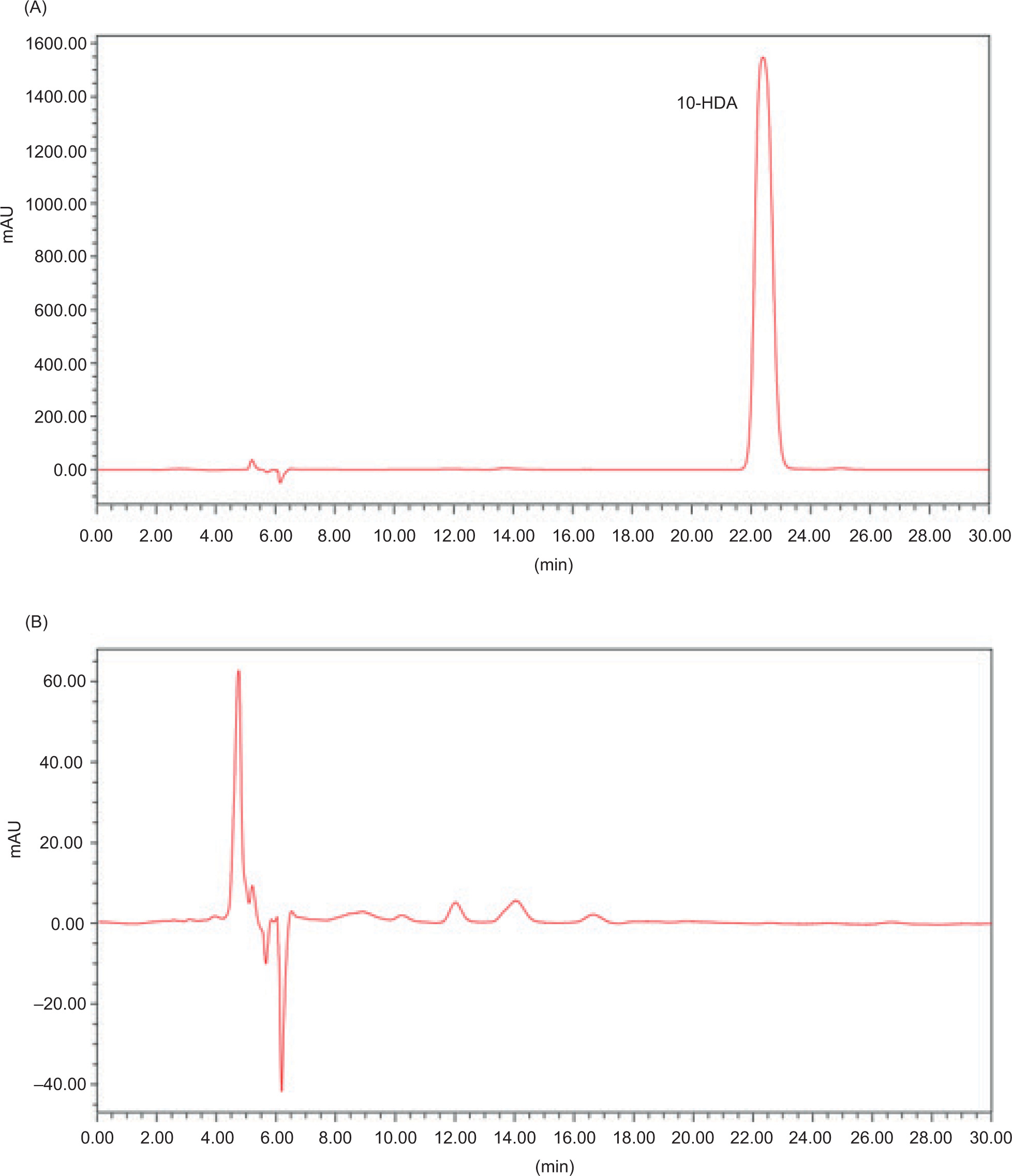 Figure S3. The HPLC assay for 10-HDA in 10-HDA solution and erythrocyte lysate without 10-HDA addition. (A) is the HPLC graph for the 10-HDA solution. (B) is the HPLC graph for the erythrocyte lysate in which the 10-HDA is not added.