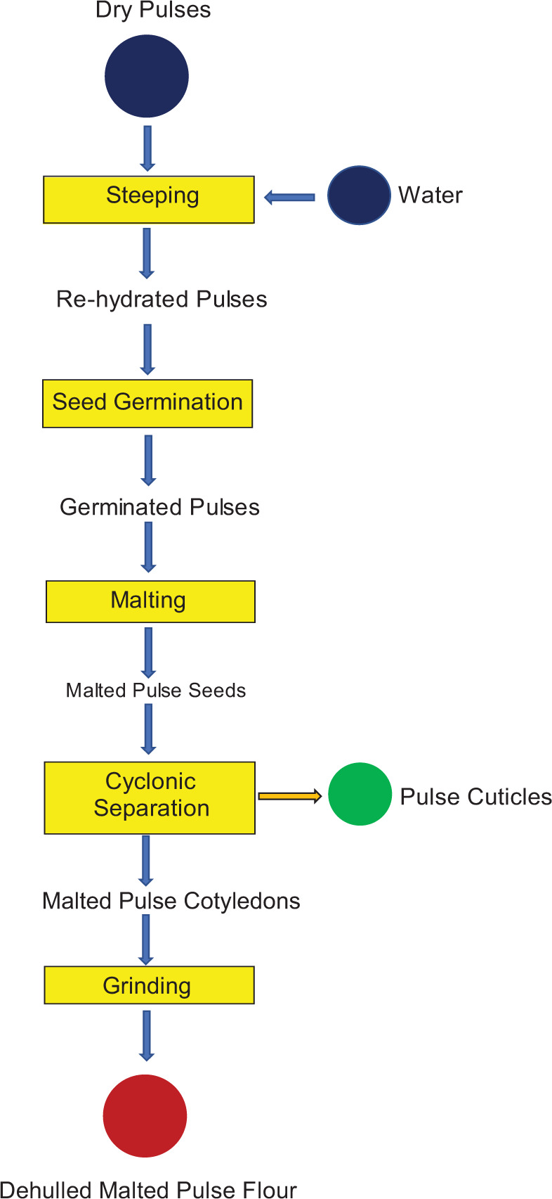 Figure 1. Schematic of the dehulled malted pulse flour production process set up previously (Cimini et al., 2021, 2023a, 2024).