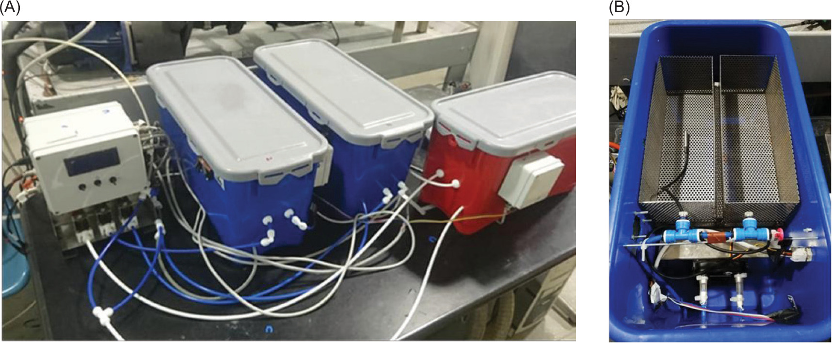 Figure 2. Pictures of the bench-top plant used in this work: (A) insulated chamber, and (B) perforated baskets.