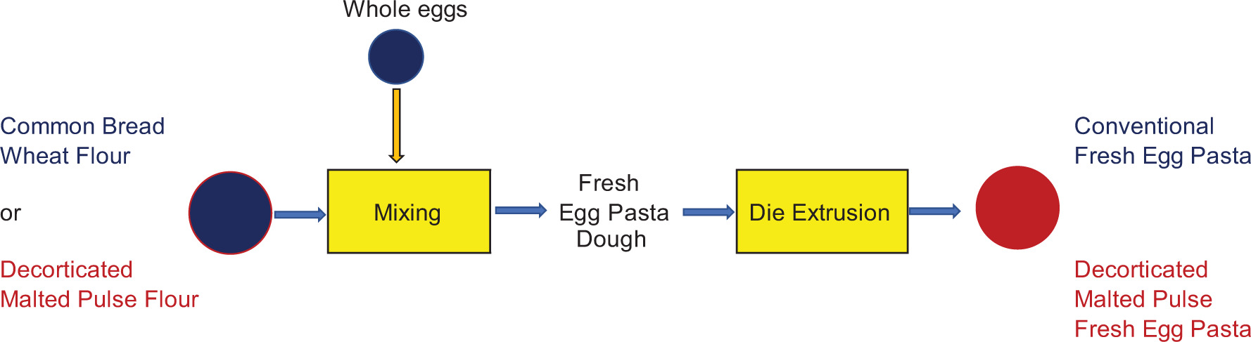Figure 3. Schematic of fresh egg pasta production process using common bread wheat flour or decorticated malted pulse flour.
