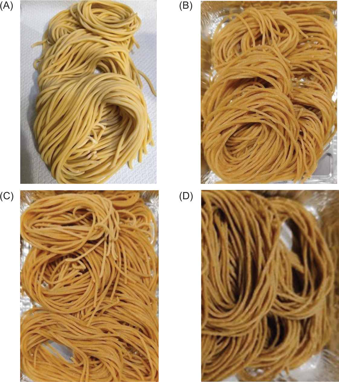 Figure 4. Pictures of fresh egg pastas made from (A) whole egg and common bread wheat flour type 00 or (B) dehulled malted GPB flour, (C) SDC flour, or (D) OL flour; the latter being extracted from Cimini et al. (2024).