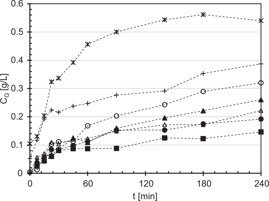 The simulated starch digestion process for the cooked fresh egg pasta samples examined here yielded the digestograms (plot of glucose concentration, CG, as discharged by enzymatic treatments against digestion time, t) shown in Figure 5.