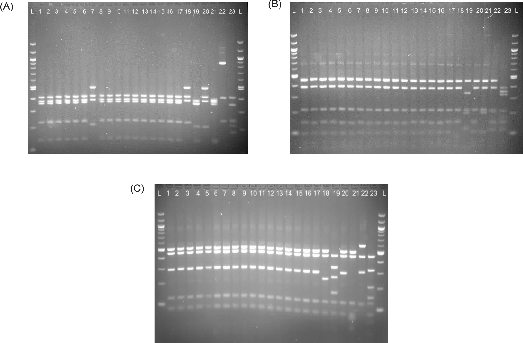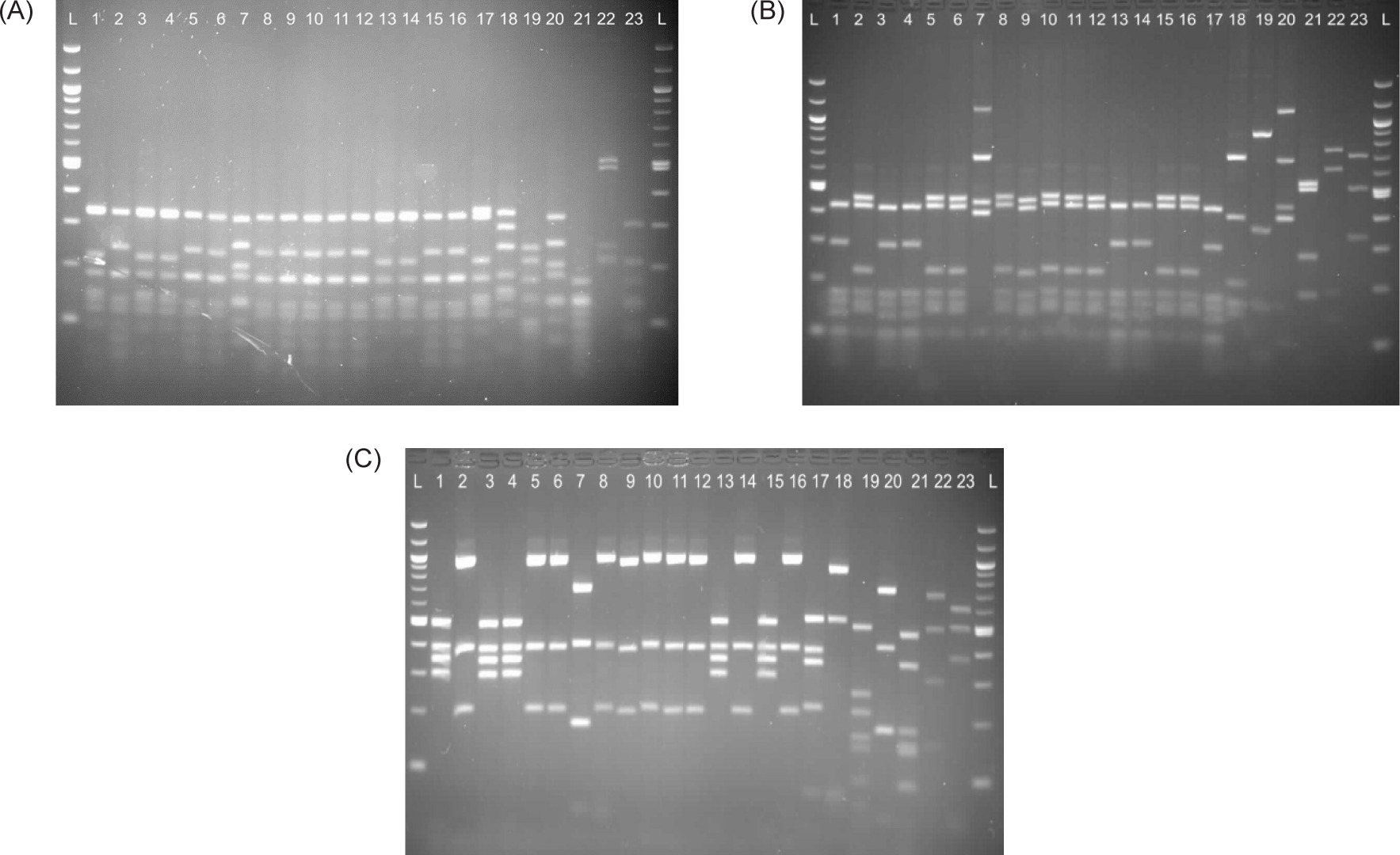 Figure 2. Restriction profile of 16S rRNA gene of Alicyclobacillus isolates obtained with (A) HinP1I, (B) HphI, and (C) HaeIII. L: 100-bp DNA ladder; isolates 1–6: A5, A16, A17, A27, A28, A30; isolate 7: A. hesperidum 6G, isolates 8–14: B1, B6, B18, B19, B20, B30, B31; isolate 15: A. acidoterrestris B41; isolate 16: A. acidoterrestris type IDSM 2498; isolate 17: A. acidoterrestris type IIATCC 49025; isolate 18: A. acidiphilus DSM 14558 ; isolate 19: A. herbarius DSM 13609; isolate 20: A. hesperidum DSM 12489; isolate 21: A. acidocaldarius DSM 446; isolate 22: Bacillussubtilis ATCC 6655; and isolate 23: Geobacillus stearothermophilus ATCC 7953.