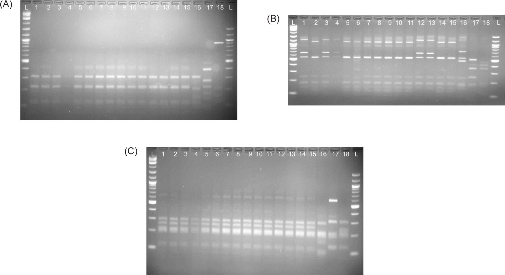 Figure 4. Restriction profile of partial vdc operon of Alicyclobacillus isolates obtained with (A) HinP1I, (B) HphI, and (C) HaeIII. L: 100-bp DNA ladder; isolates 1–13: A5, A16, A17, A27, A28, A30, B1, B6, B18, B19, B20, B30, B31; isolate 14: A. acidoterrestris B41; isolate 15: A. acidoterrestris type IDSM 2498; isolate 16: A. acidoterrestris type IIATCC 49025; isolate 17: A. acidiphilus DSM 14558; isolate 18: A. herbarius DSM 13609.