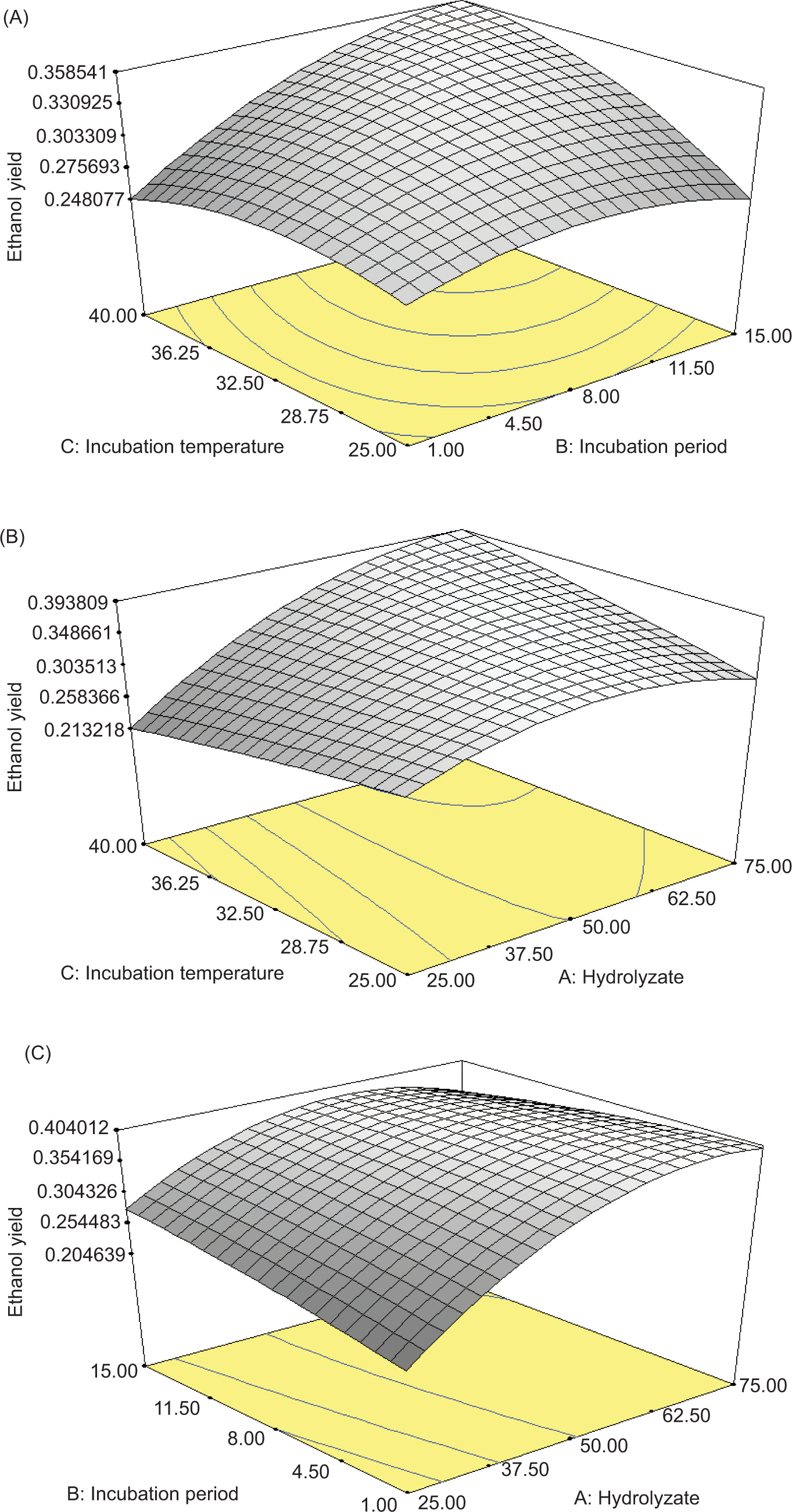 Figure 1. Presentation of 3D surface graphs for ethanol yield in central composite design (CCD) for S. cerevisiae K7 yeast isolate indicated by the interactions of hydrolyzate, incubation temperature, and incubation time (A–C).