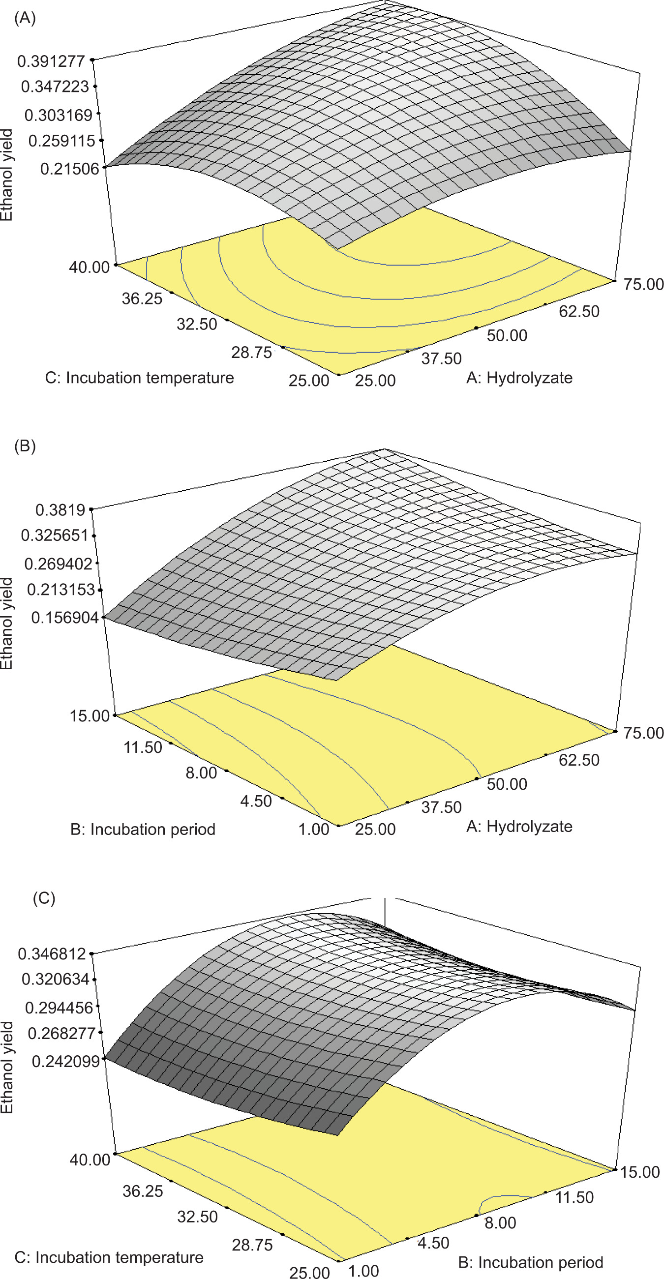 Figure 2A presents a slight increase in yield with an increase in incubation period and hydrolyzate. In Figure 2B, an increasing response was observed for 62.5 mL hydrolyzate, followed by a slight decrease. Temperature had no effect on response with hydrolyzate. A sharp increase was observed with increase in incubation temperature and time (Figure 2C).