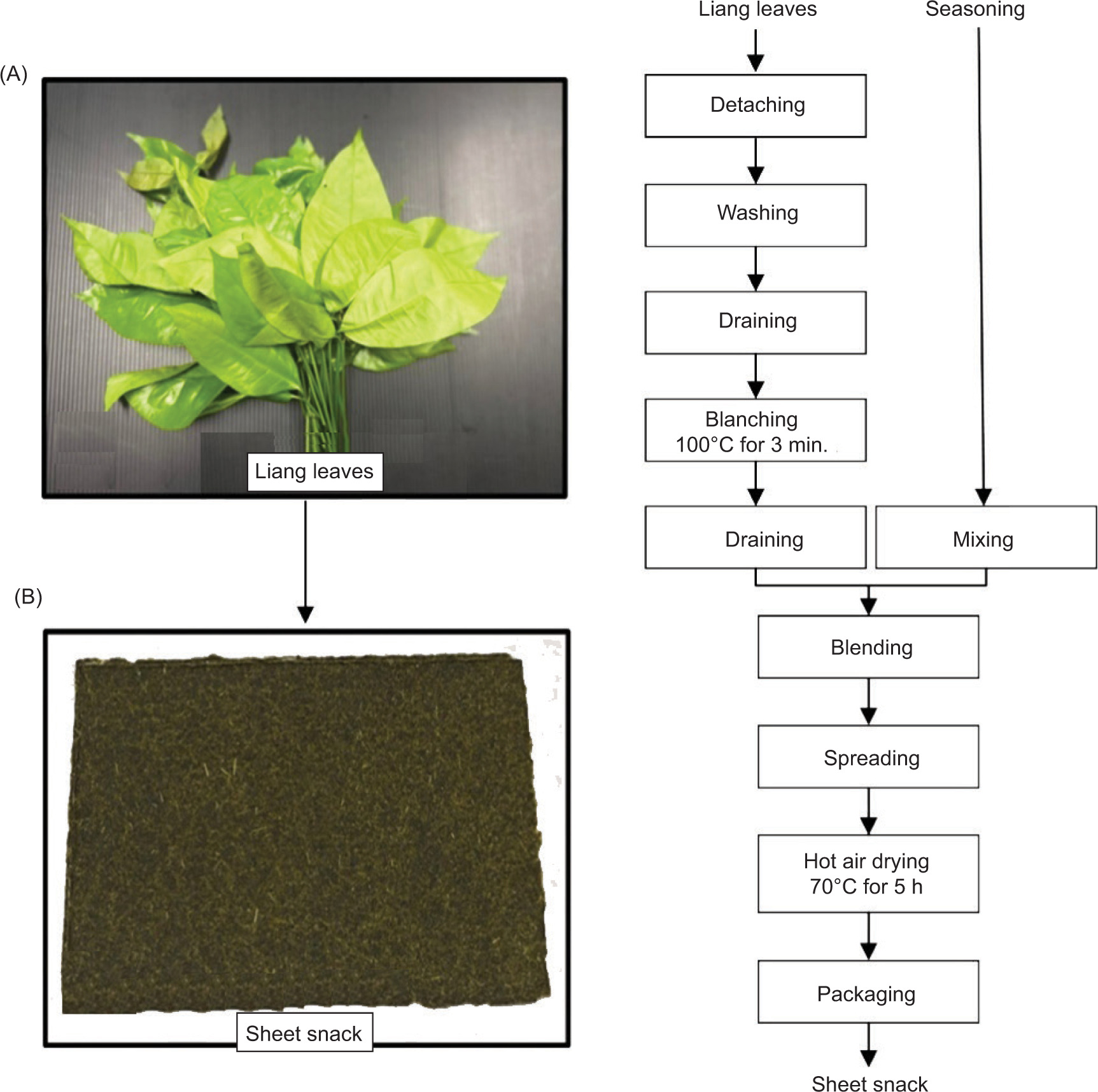 A flowchart of sheet snack preparation process is shown in Figure 1. Liang leaves (Gnetum gnemon var. tenerum) of intermediate edible stage (Pae Salat) (Figure 1A) were purchased from a local farm. The stems were detached and leaves without stems were washed with chlorinated water at 100 ppm for 15 min to clean and remove debris. The leaves were washed twice with running tap water to control chlorine residue (<1 ppm as a safety regulation) and drained on a basket for 10 min, with thickness of overlay leaves being not more than 1 cm. Liang leaves were blanched with brine water (NaCl 1%) for 3 min at 100oC and then immediately cooled with cold water. Excess water was drained.