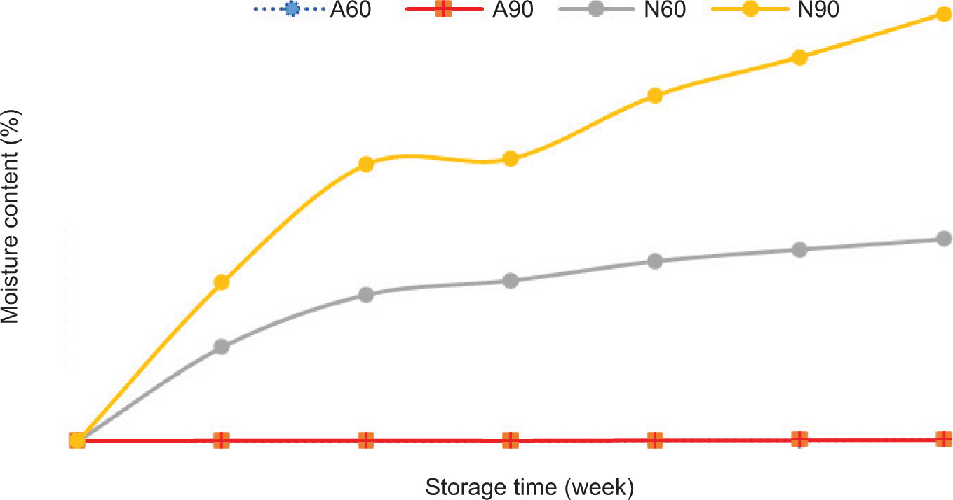 The principle of dried food is to extend shelf life by decreasing aw and subsequently reducing chemical reactions and microorganism activity (Prabhakar and Mallika, 2014). Dried food requires storage at low RH in a cool environment. Increasing aw in dried food leads to the growth of microorganism, chemical reactions, and physical changes (Allen, 2018; Ciesarova et al., 2006). Higher RH in N90 caused greater changes in sensory scores than in N60. A further increase in aw by water absorption led to sticky texture, and unpleasant taste and flavor, resulting in lower overall acceptability and consumer acceptance. The panelists perceived a bitter taste and sticky texture in N60 and N90 after storage for 4 weeks. High RH (80%) led to high water reabsorption, leading to increased rancidity, bitter taste, chewiness, and no crispiness found in English walnuts (Mitcham et al., 2022). Therefore, A60 and A90 samples offered a better retention of sensory qualities over time.