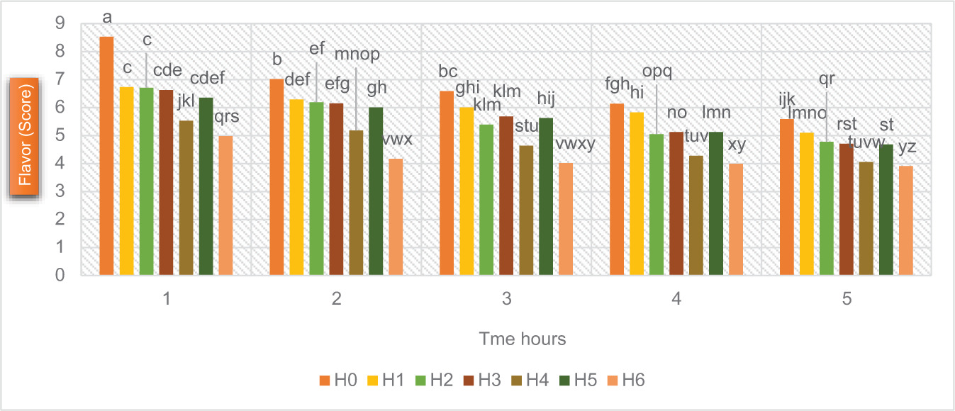 Figure 5. Effect of treatment and storage on the flavor of bread. In which all the treatments showed their sensory base average scores range. A significant maximum flavor score was found in Ho (8.53 ± 0.34), and the minimum was observed in H6 (3.91 ± 0.18). (1 = 0 h, 2 = 24 h, 3 = 48 h, 4 = 72 h, 5 = 96 h); h = Hours